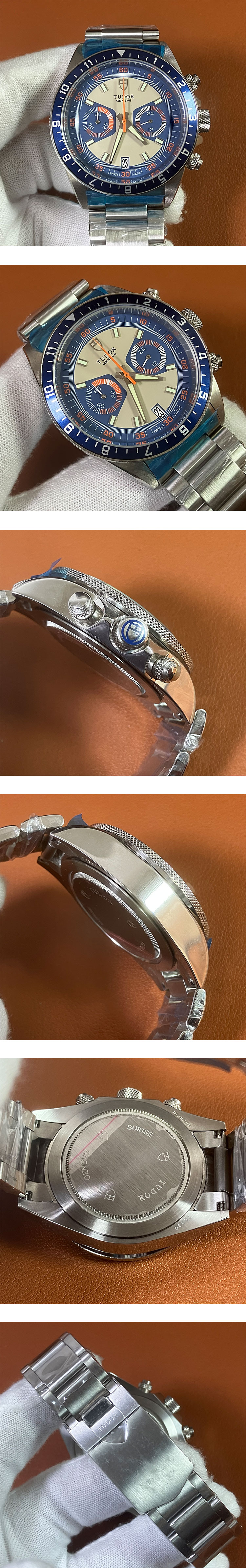 文字盤: クロノグラフインダイヤル表示、6時位置カレンダー表示、文字盤ライトゴールド文字盤