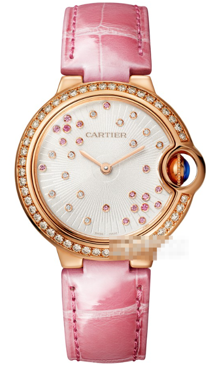まず、この時計の最大の特徴は、その「ピンク」の選択にあります。派手な印象を与えがちなピンクとは一線を画し、上質で落ち着いた印象の色合いは、大人の女性らしさを完璧に表現しています。これは、カルティエならではの色彩へのこだわりと言えるでしょう。そして、ボールン ブルー特有の、流れるような丸みを帯びたケースと、特徴的なプロテクションボーン(竜頭カバー)が、この柔らかなピンクをさらに優雅に包み込みます。ダイアルには清楚なローマ数字、そしてあのカルティエのブランド名が刻まれており、細部までこだわりが光ります。