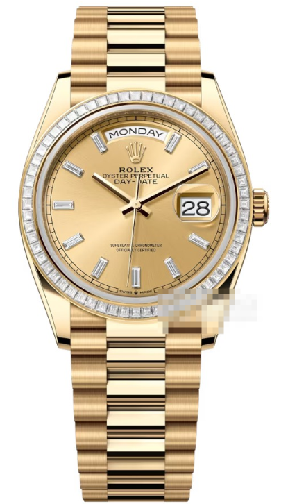 この時計の核心は、その「祝福に満ちた輝き」を、決して俗悪ではなく、威厳のあるものに昇華させたデザインにあります。36mmのイエローゴールド・ケースと象徴的なプレジデントブレスレットは、ダイヤモンド・セットされたベゼルによって、力強さと華やかさを兼ね備えています。しかし、真の主役は、その「オーバル」模様の文字盤かもしれません。一つひとつの模様が光を複雑に反射し、ダイヤモンドの輝きと調和して、静的でありながらも尽きることのない深みを生み出します。これは、一瞬の閃光のような派手さではなく、確固たる存在感に基づく、持続的な輝きです。