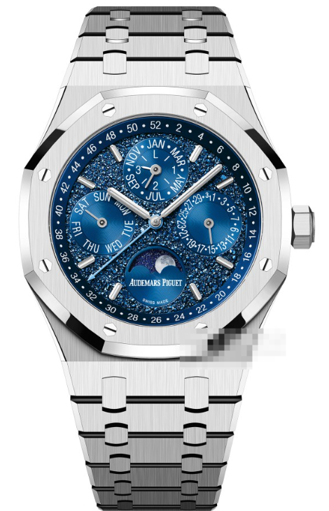 その美しさは、第一に、比類なきバランスに宿ります。伝説のデザインである八角形のベゼルと「ティッセ」彫刻が施された青みがかったグレーの文字盤は、時計のアイコンとしての力強さを失わず、41mmのホワイトゴールドケースは、光沢よりも温かみのある「静寂の輝き」を放ちます。しかし、真の核心はその複雑な機能にあります。「永久カレンダー」と呼ばれる機構は、月日の長さの違いや閏年をも自動的に計算し、理論上2100年まで日付調整を必要としません。文字盤上に配された大小のサブダイヤルは、年月日や月齢を表示する情報の舞台でありながら、レイアウトの妙によって驚くほどの調和と秩序を生み出しています。これは、最高峰の機械技術が、完璧なデザインの服をまとった姿なのです。