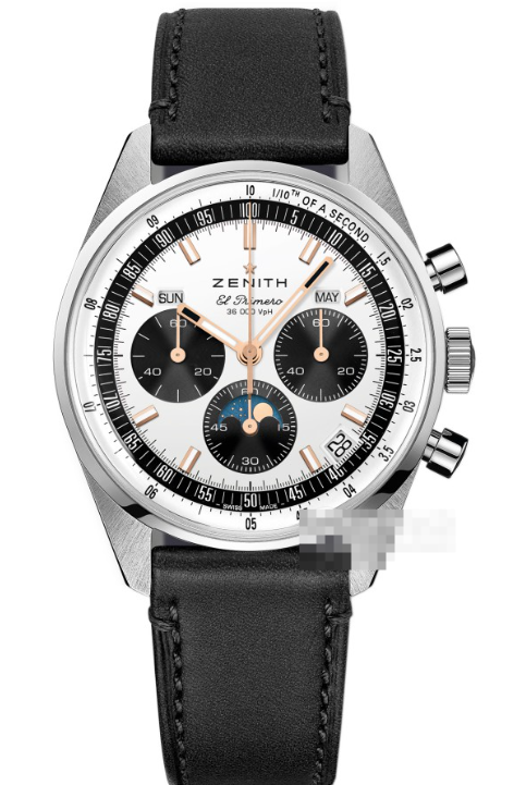 この時計の核心は、何よりもその 「超高速で鼓動するハート」 にあります。1969年に世界初の自動巻きクロノグラフムーブメント「エル・プリメーロ」を生み出したゼニスが、現代に放つ傑作が、1時間に36,000振動(5Hz)という超高速で動作する「エル・プリメーロ 3620 SC型」自動巻きムーブメントです。この驚異的な高振動数は、秒針が目に見えて滑らかに(1秒間に10回)駆け抜ける、類まれな視覚的滑らかさと、長期的な高い精度を実現しています。文字盤の9時位置に設けられた「オープンハート(スケルトン)」は、この精巧な心臓部が生きている様子を瞬時に伝え、技術に対する畏敬の念を呼び起こします。