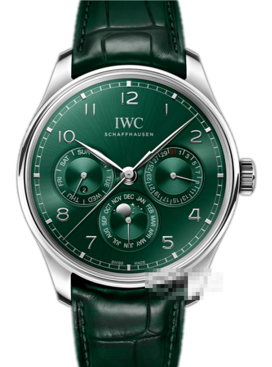 最大の特徴は、その深みあるグリーンの文字盤にあります。光の加減によって鮮やかなエメラルドグリーンから落ち着いたダークグリーンへと微妙に表情を変え、単なる「緑」ではなく、成熟した味わいと現代的な洗練さを同時に感じさせます。ポルトギーゼシリーズの象徴である、シンプルで読みやすいアラビア数字インデックスとスリムなリューズはそのままに、この新しいカラーがクラシックなデザインに驚くほど新鮮な生命を吹き込んでいます。