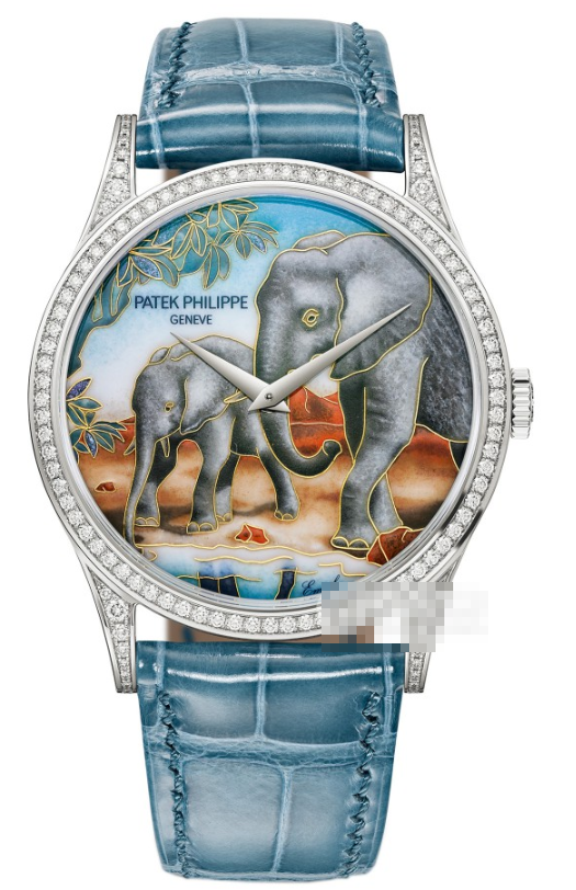 本モデルの最大の特徴は、なんといっても文字盤全体に広がる「ナミビア白象」の掐丝琺瑯(クラソネエナメル)です。水場を訪れた親子の象が、丹念に描き出されています。この繊細な絵画は、単なる印刷ではなく、熟練の琺瑯職人が一点一点手作業で生み出す、まさに芸術品。約7日間もの歳月をかけて完成されるこの文字盤は、同じものは世界に二つと存在しません。