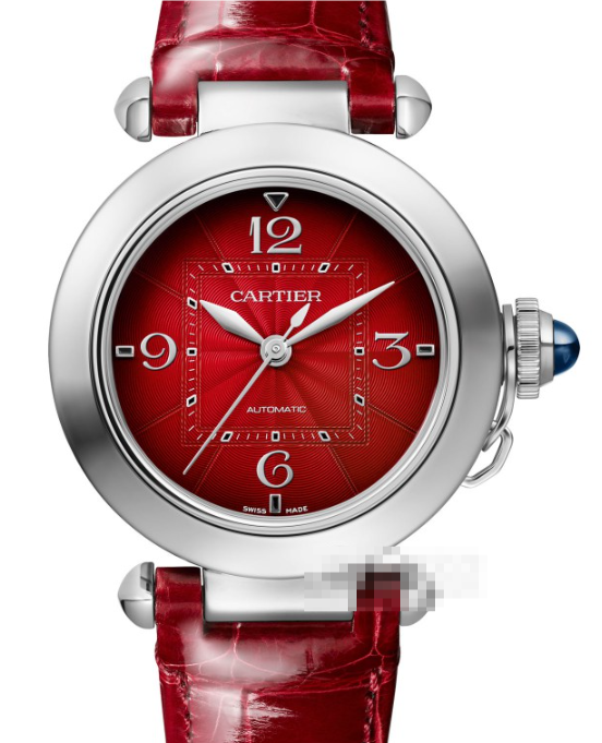 このモデルを見た瞬間、多くの人が息を呑みます。深みのあるバーガンディに近いレッドダイヤルは、光の角度によって表情を変え、時には情熱的に、時には落ち着いた大人の色香を漂わせます。そこに配されたシルバーのアラビア数字インデックスが、カルティエらしい気品をプラス。派手すぎず、しかし確実に存在感を放つこの絶妙なバランスこそ、パシャシリーズの真骨頂です。