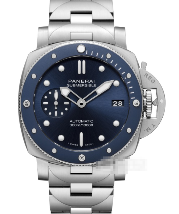 文字盤は、深みのあるブルー。PANERAIの代名詞でもあるサンドイッチ構造を採用し、下層に夜光塗料を仕込むことで、暗闇での圧倒的な視認性を実現しています。太いアラビア数字と棒状インデックス、そして特徴的なドルフィン針には、たっぷりと夜光塗料が塗布され、深海でも一瞬で時刻を読み取ることができます。3時位置には日付表示窓を備え、日常使いの実用性もバッチリです。