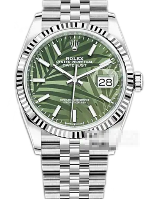 まず目を奪われるのは、36mm径のオイスタースチールケースと、18Kホワイトゴールド製フルーテッドベゼルの絶妙な調和です。このサイズは、男女を問わず幅広い方にフィットする黄金比。大きすぎず小さすぎない絶妙なバランスが、スーツの袖口にもカジュアルな装いにも自然と溶け込みます。ポリッシュ仕上げとヘアライン仕上げを巧みに使い分けたケースは、光の加減で様々な表情を見せ、身につける人の品格を高めてくれます。