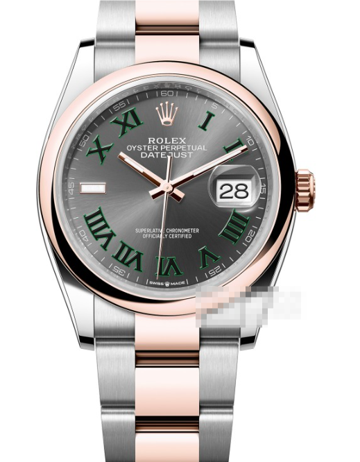 このモデルは、オイスタースチールのケースに18Kエバーローズゴールドのフルーテッドベゼルを組み合わせている。エバーローズは、イエローゴールドほど派手ではなく、ピンクゴールドのような甘さも控えめ。日本人の肌色に非常に馴染みやすく、どんなシーンでも浮かない。フルーテッド(溝付き)のベゼルが光をきれいに反射するので、遠目にも「あ、ロレックスだ」とわかる存在感がある。ケース径は36mm。男女を問わず使いやすいサイズで、スーツの袖口にもすっと収まる。