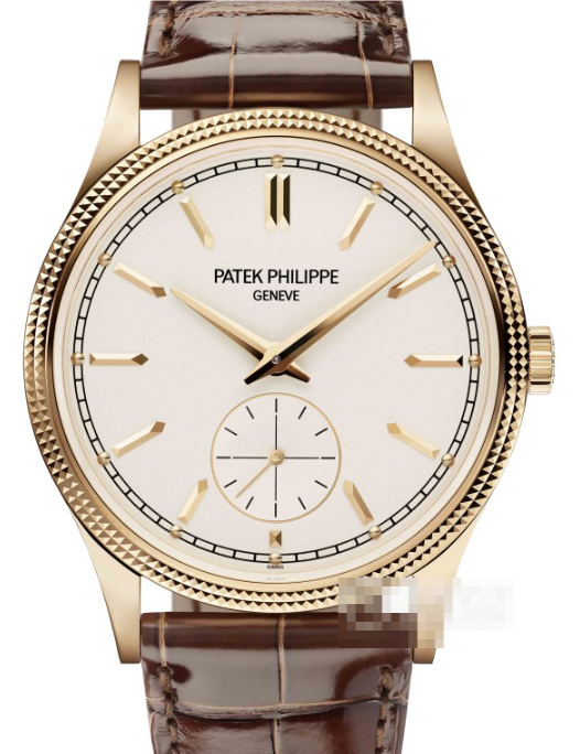 ケース径は39mm。近年のドレスウォッチとしてはやや大きめだが、クラシックなカラトラバは36mmが定番だった。ここは好みが分かれる。素材は18Kローズゴールド。ポリッシュ仕上げのケースは、ベゼルに「ホーボーンノブ」と呼ばれる繊細な凹凸パターンが施されている。これは手作業によるギヨシェ彫りの一種で、光を受けると複雑な陰影を描く。文字盤はオパーリンシルバー。サンレイ仕上げで、センターから外周にかけて淡いグラデーション。インデックスはゴールドのバトン型。6時位置にスモールセコンド。シンプルの極みだ。