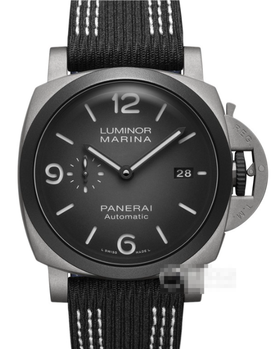 「パネライって、重いんでしょ?」――そう思っているあなた。このPAM01122を手に取った瞬間、そのイメージがガラリと変わる。なぜなら、ケースに使われているのはグレード5チタニウム。ステンレスと比べて約40%軽い。44mmの堂々たるサイズなのに、腕に乗せると「え、こんなに軽いの?」と声が出てしまう。